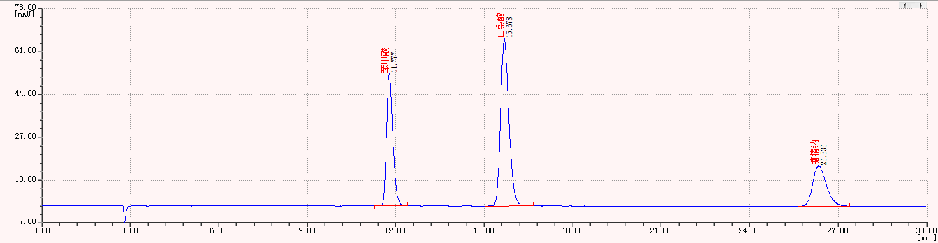 對照品溶液:分別將苯甲酸,山梨酸,糖精鈉標準品配成1mg/mL的溶液。然后分別用甲醇將苯甲酸鈉,山梨酸鉀溶液稀釋成0.32mg/mL,0.16mg/mL,0.08mg/mL,0.04mg/mL,0.02mg/mL的溶液。糖精鈉溶液用水稀釋成0.32mg/mL,0.16mg/mL,0.08mg/mL,0.04mg/mL,0.02mg/mL的溶液。