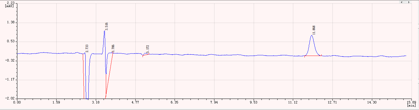 將上述配好的雪碧溶液吸取10?μL注入液相色譜儀記錄色譜峰面積,使用外標法計算含量。測得市售雪碧中苯甲酸的含量為0.14g/kg。小于國家規定的0.2g/kg的標準。